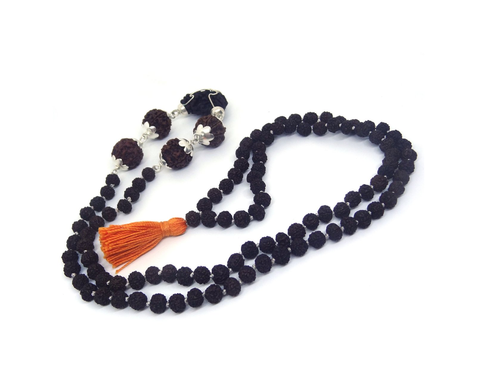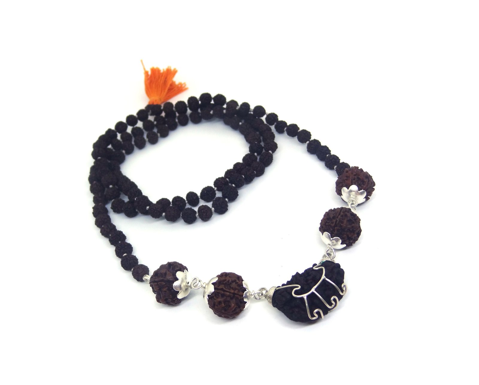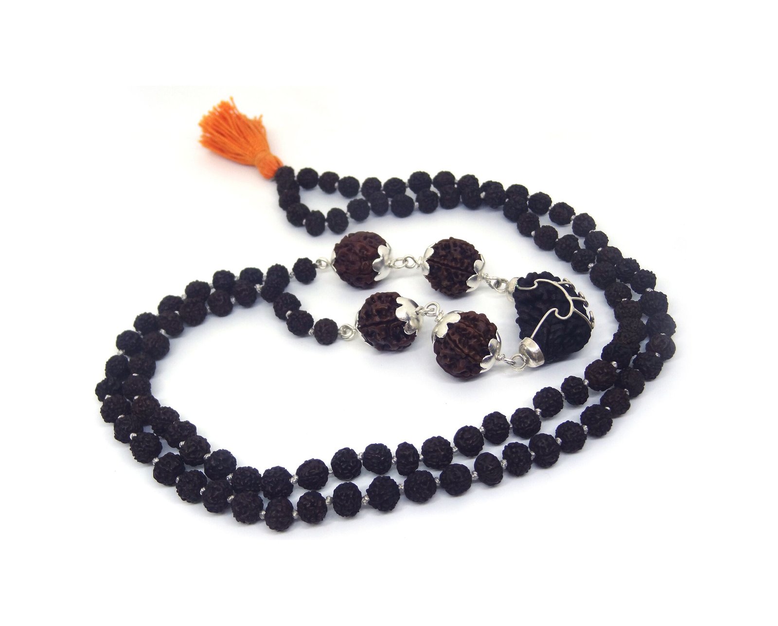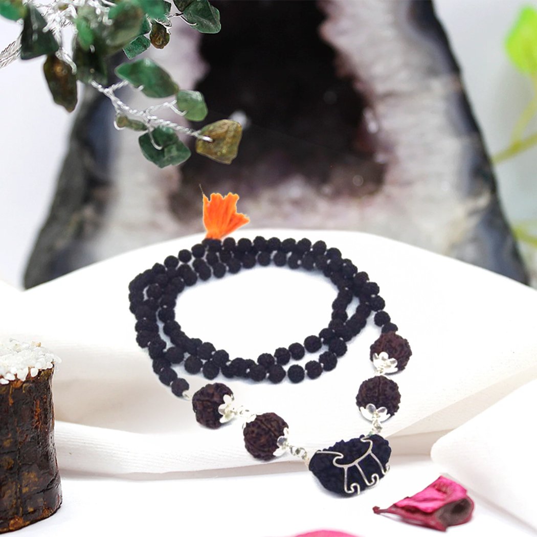 - One Mukhi Rudraksha with 4, 5, 6, 7 mukhi Rudraksha strung in 104 beads in 5 Face Rudraksha Mala.